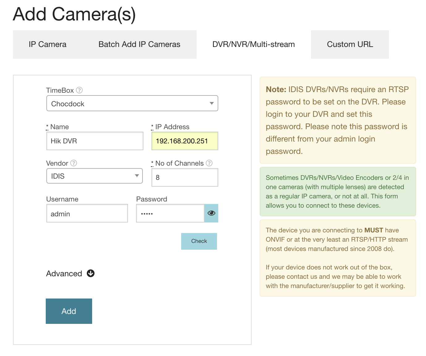 If DVR is not in the list, you will need to find the correct RTSP URL for your DVR. You can enter this URL under the "Custom URL" tab of the "New Camera(s)" dialog.